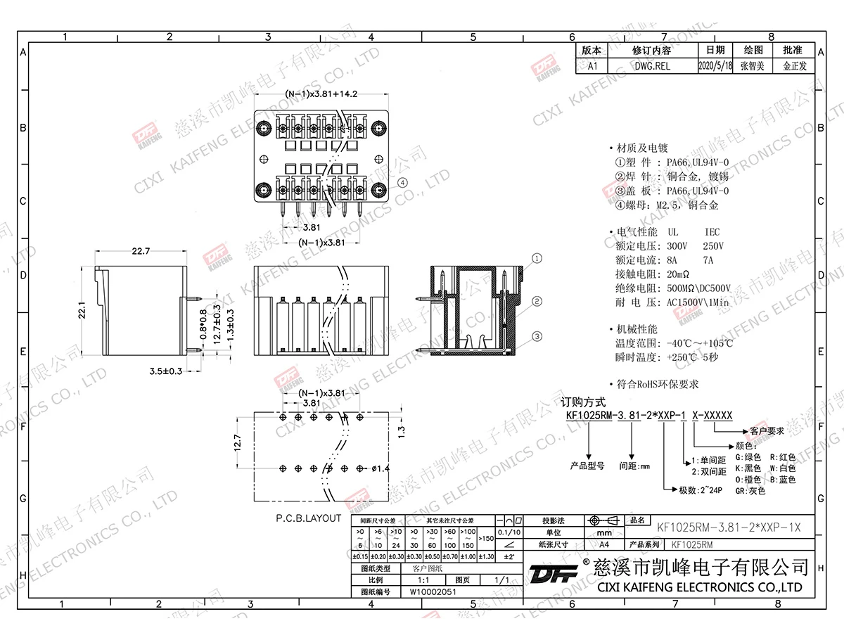 插拔式连接端子 材质电镀:触点: -焊针: 黄铜,镀锡塑件: PA66,UL94V-0电气性能ULIEC额定电压300V 250V 额定电流8A7A接触电阻20mΩ绝缘电阻500MΩ/DC500V耐电压AC1500V/1min使用线径-机械性能温度范围-40℃~+105℃ 瞬时温度+250℃, 5sec扭矩-剥线长度-