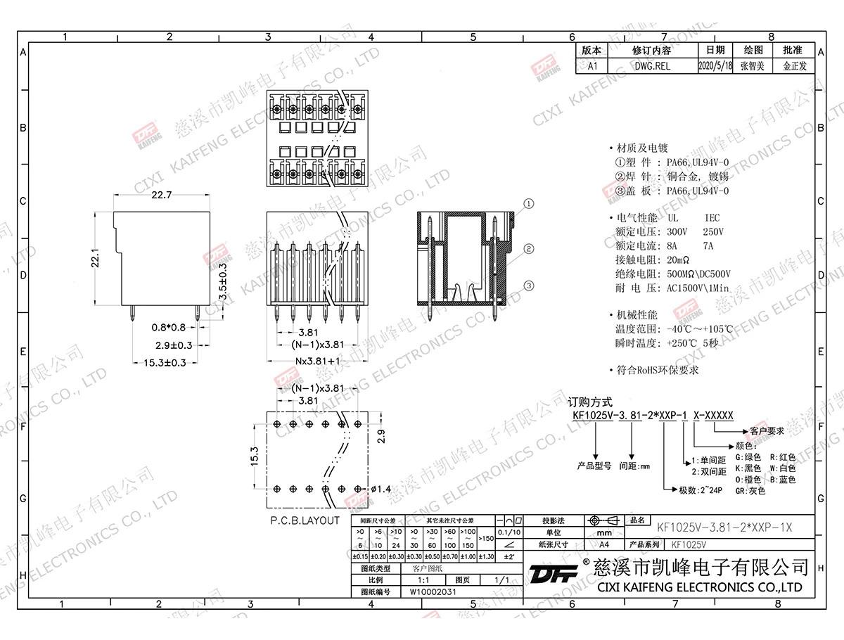 材质电镀:触点: -焊针: 黄铜,镀锡塑件: PA66,UL94V-0电气性能ULIEC额定电压300V 250V 额定电流8A7A接触电阻20mΩ绝缘电阻500MΩ/DC500V耐电压AC1500V/1min使用线径-机械性能温度范围-40℃~+105℃ 瞬时温度+250℃, 5sec扭矩-剥线长度-