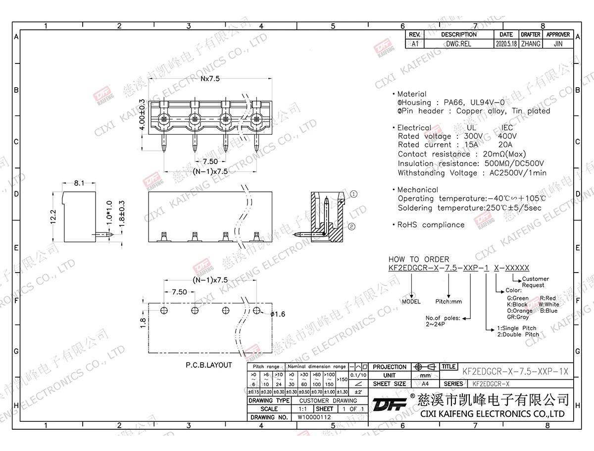 Pluggable Terminal Block MATERIAL:contact: -Pin header: Brass, Tin platedHousing: PA66,UL94V-0ElectricalULIECRated voltage300V 400V Rated current15A20AContact resistance20mΩInsulation resistance500MΩ/DC500VWithstanding voltage AC2500V/1minWire range-MechanicalTemp.rang-40℃~+105℃ Max.soldering+250℃, 5secTorque-Strip length-