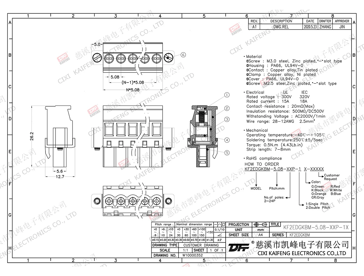 Pluggable Terminal Block MATERIAL:M3.0,Steel Zinc platedcontact: Phosphor bronzeSquare: --Housing: PA66,UL94V-0ElectricalULIECRated voltage300V 320V Rated current15A18AContact resistance20mΩInsulation resistance500MΩ/DC500VWithstanding voltage AC2000V/1minWire range28-12AWG 2.5mm²MechanicalTemp.rang-40℃~+105℃ Max.soldering+250℃, 5