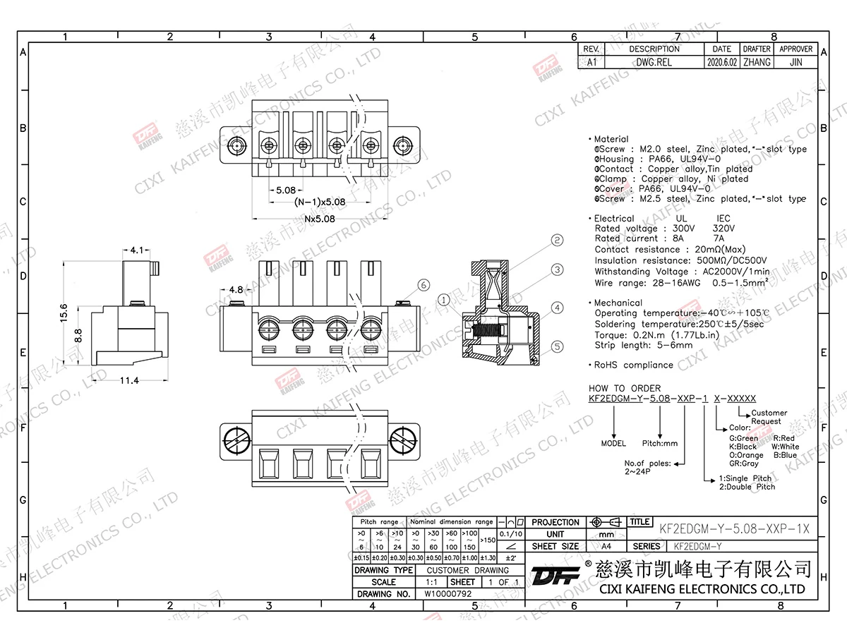 MATERIAL:M2.0,Steel Zinc platedcontact: Phosphor bronzePin header: -Housing: PA66,UL94V-0ElectricalULIECRated voltage300V 320V Rated current8A7AContact resistance20mΩInsulation resistance500MΩ/DC500VWithstanding voltage AC2000V/1minWire range28-16AWG 0.5-1.5mm²MechanicalTemp.rang-40℃~+105℃ Max.soldering+250℃,