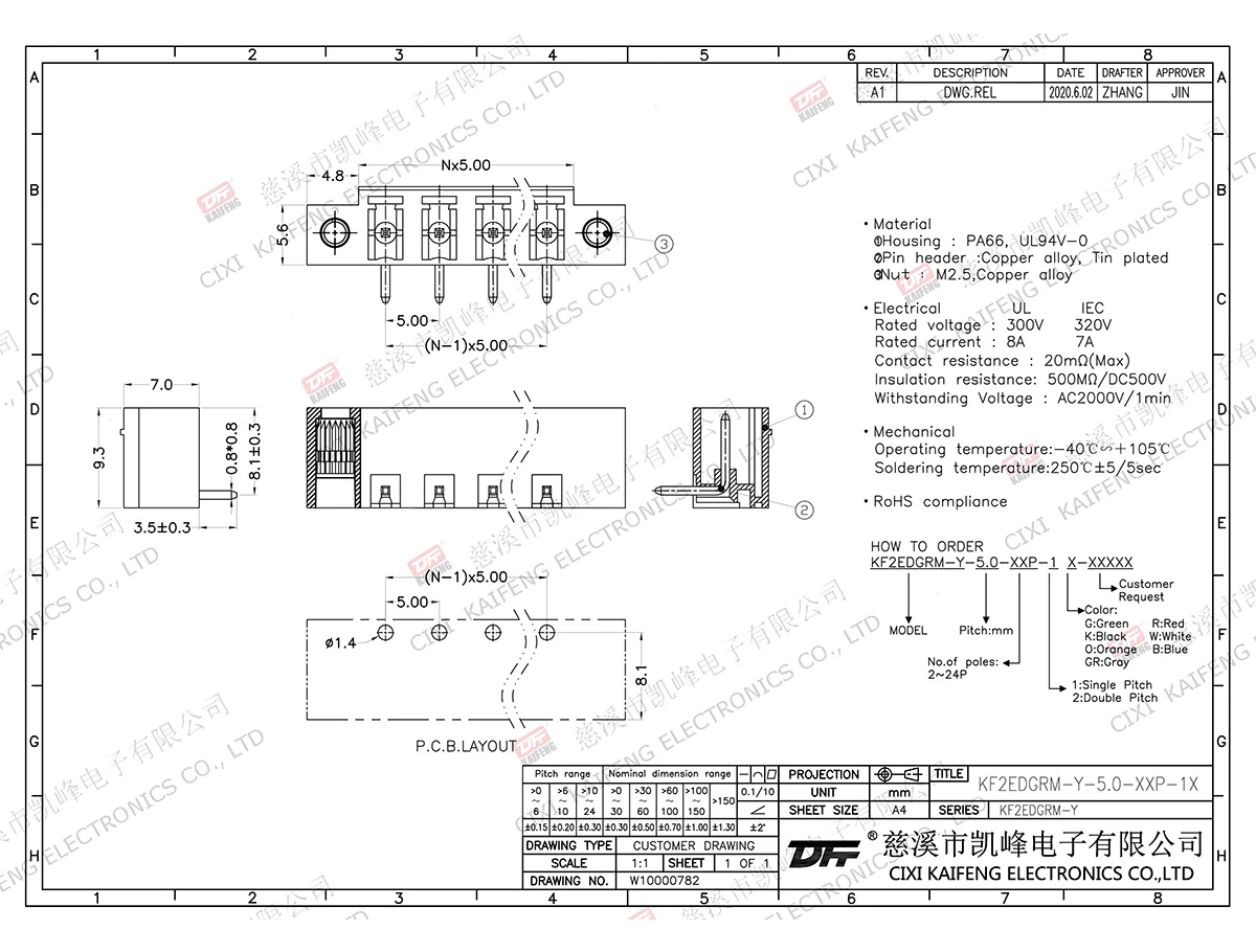 Pluggable Terminal Block MATERIAL:MATERIALScrews: -contact: -Pin header: Brass, Tin platedHousing: PA66,UL94V-0ElectricalULIECRated voltage300V 250V Rated current8A7AContact resistance20mΩInsulation resistance500MΩ/DC500VWithstanding voltage AC1500V/1minWire range-MechanicalTemp.rang-40℃~+105℃ Max.soldering+250℃/ 5secTorque-Strip length-