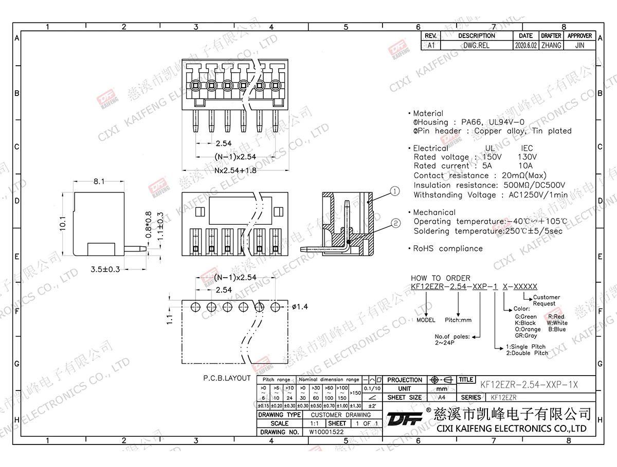 MATERIAL:contact: -Pin header: Brass, Tin platedHousing: PA66,UL94V-0ElectricalULIECRated voltage150V 130V Rated current5A10AContact resistance20mΩInsulation resistance500MΩ/DC500VWithstanding voltage AC1250V/1minWire range-MechanicalTemp.rang-40℃~+105℃ Max.soldering+250℃,5secTorque-Strip length-