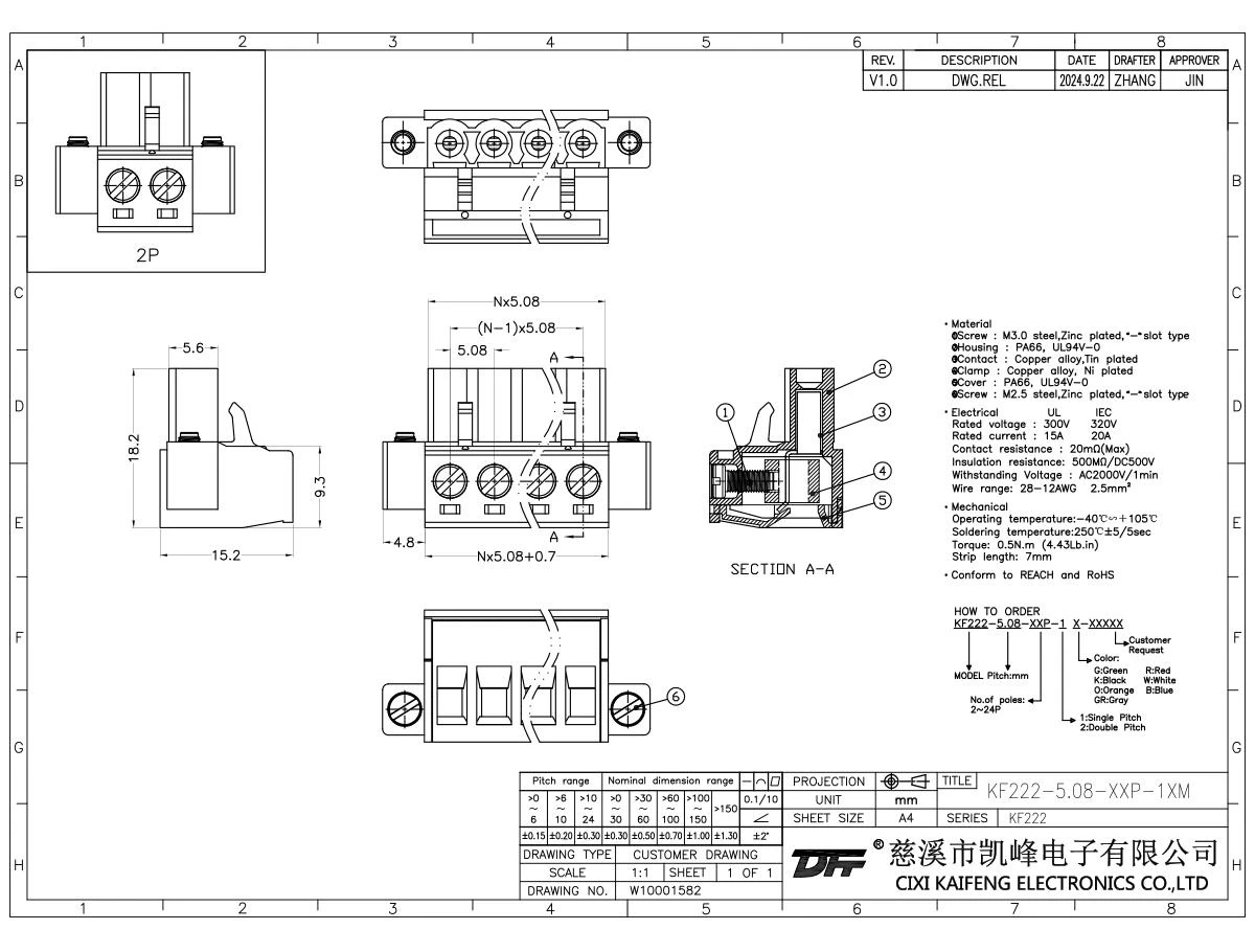 Pluggable Terminal Block MATERIAL:M2.5,Steel Zinc platedcontact:Phosphor bronzePin header:-Housing:PA66,UL94V-0ElectricalULIECRated voltage300V320VRated current15A10AContact resistance20mΩInsulation resistance500MΩ/DC500VWithstanding voltage AC2000V/1minWire range28-12AWG2.5mm²MechanicalTemp.rang-40℃~+105℃Max.soldering+250℃,5secTorque0.4N.m3.5Lb.inStrip length7-8mm
