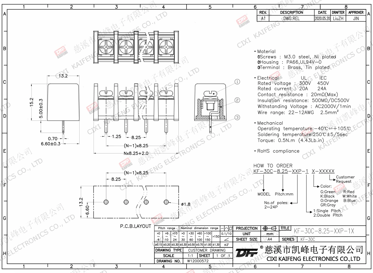 Material:M3.0 Steel,Ni platedTerminal:Brass,0.7t Ni platedHousing: PA66,UL94V-0ElectricalULIECRated voltage300V 450V Rated current15A24AInsulation resistance500MΩ/DC500VWithstanding voltage AC2000V/1minWire range22-12AWG 2.5mm²MechanlicalTemp.rang-40℃~+105℃ Torque0.5N.m 4.4Lb.in