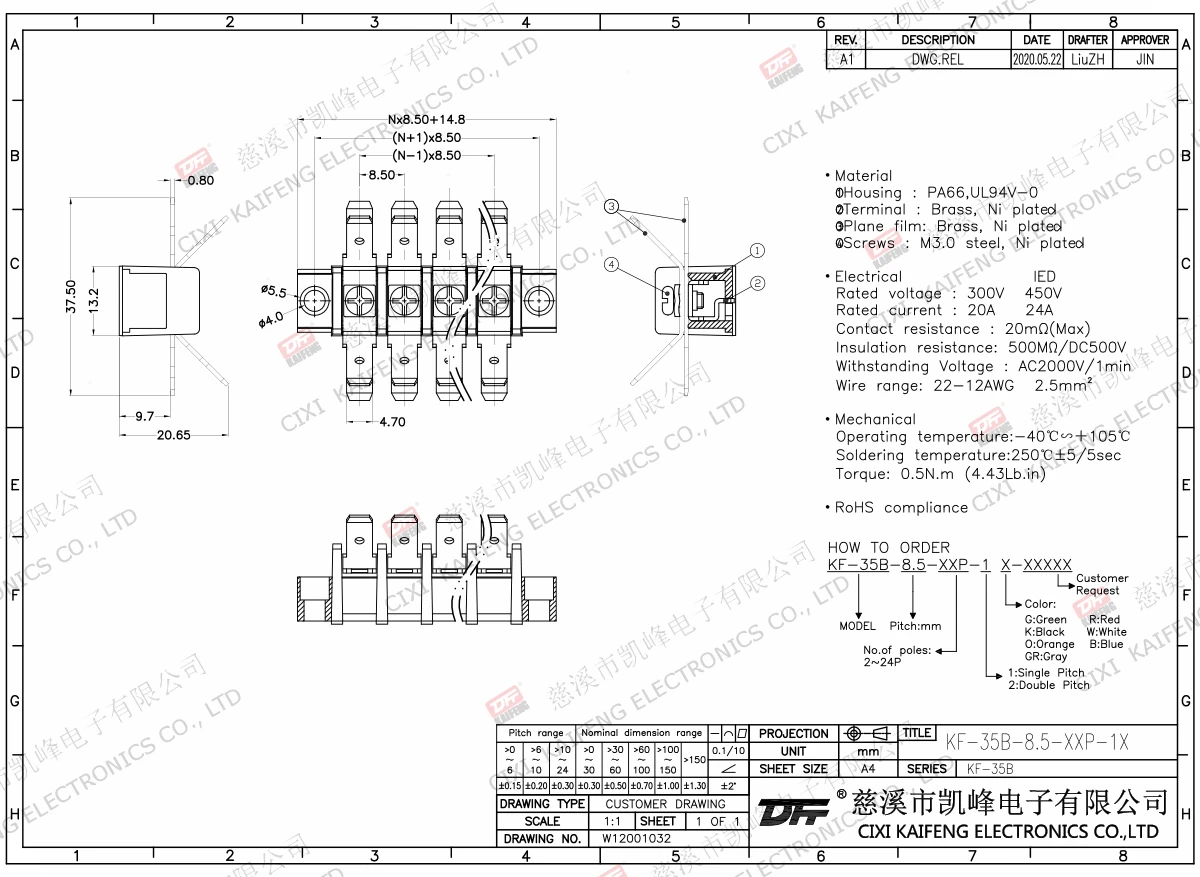 Material:M3.0 Steel,Ni platedTerminal:Brass,0.8t Ni platedHousing: PA66,UL94V-0ElectricalULIECRated voltage300V 450V Rated current20A24AInsulation resistance500MΩ/DC500VWithstanding voltage AC2000V/1minWire range22-12AWG 2.5mm²MechanlicalTemp.rang-40℃~+105℃ Torque0.5N.m 4.4Lb.in
