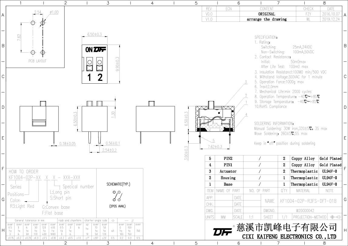 Dip Switch Material:UL94V-0 Thermoplaslic,black Cover:UL94V-0 Thermoplaslic,Red, blue, black push buttons :UL94V-0 Thermoplaslic,WhiteTerminal:Phosphor Bronze,Gold plating ElectricalElectrical life:2000 operations per switch 24VDC,25mARated