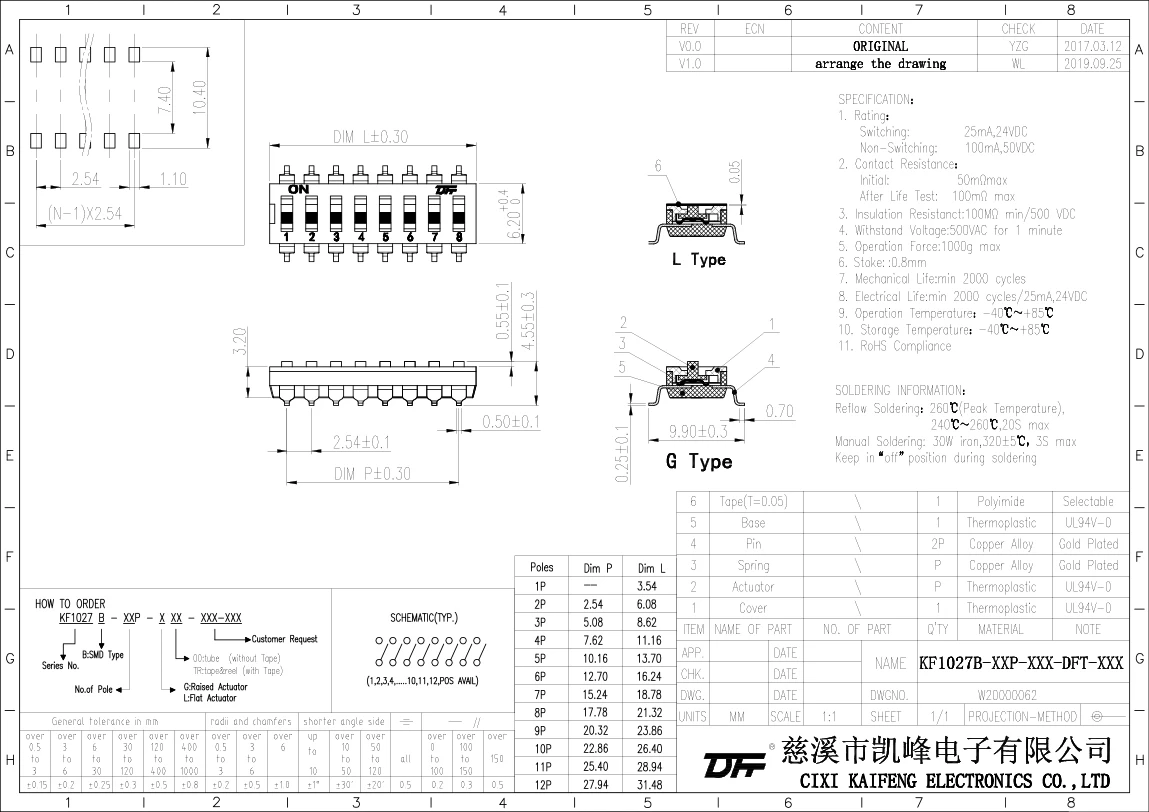 Dip Switch Material:SPECIFICATIONSRatingSwitching25mA,24VDCNon-Switching100mA,50VDCContact ResistanceInitial50mΩ/MaxAfter Life Test100mΩ/MaxInsulation Resistance100mΩ/Min.at 500VDCWiths