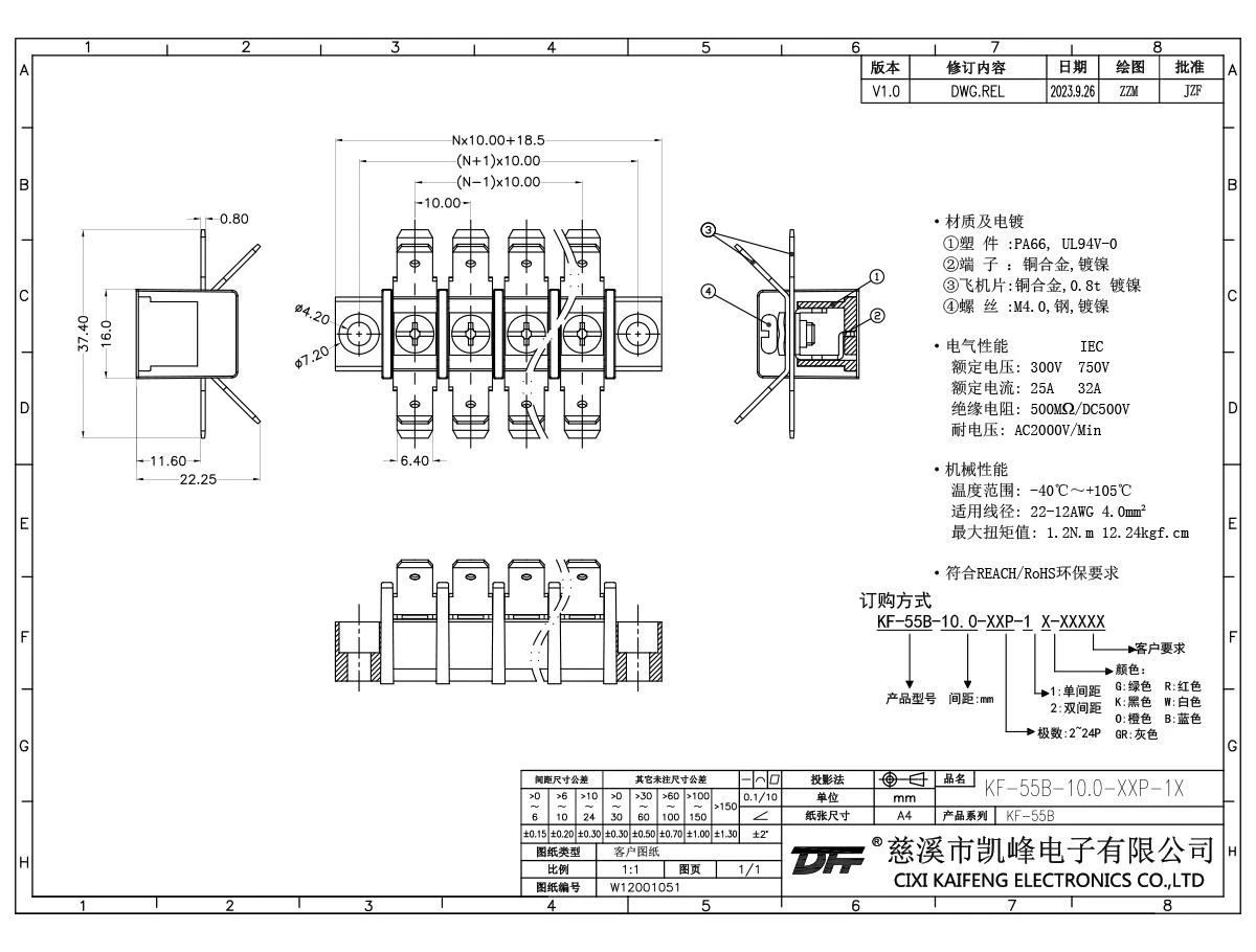 栅栏式接线端子 材质电镀:M4.0 钢,镀镍端子:黄铜,0.8t 镀镍塑件: PA66,UL94V-0电气性能ULIEC额定电压300V 750V 额定电流25A32A绝缘电阻500MΩ/DC500V耐电压AC2000V/1min使用线径22-12AWG 4.0mm²机械性能温度范围-40℃~+105℃ 扭矩1.2N.m 10.53Lb.in