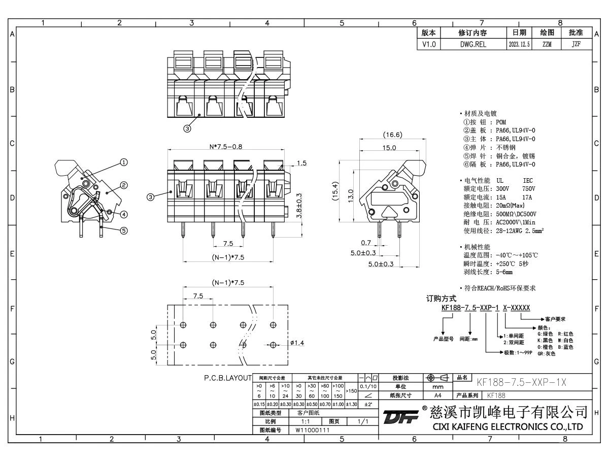免螺丝式接线端子 材质电镀:①按钮:PA66,UL94V-0②盖板:PA66,UL94V-0③主体:PA66,UL94V-0④弹片:不锈钢⑤焊针:黄铜,镀锡电气性能ULIEC额定电压300V 750V额定电流15A17A接触电阻20mΩ绝缘电阻500MΩ/DC500V耐电压AC2000V/1min使用线径28-12AWG 2.5mm²机械性能温度范围-40℃~+105℃
