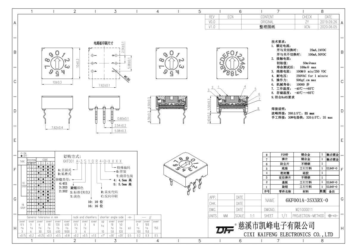旋钮开关 材质电镀:技术要求额定电流开与关切换时:25mA,24VDC 开与关不切换时:100mA,50VDC 接触电阻初始值:50mΩ max寿命测试后:100mΩ max绝缘电阻 :100mΩ min/250 VDC耐电压 :250VAC for 1 minute操作力 :500gf.cm max机械寿命 :10000步工作温度 :-4
