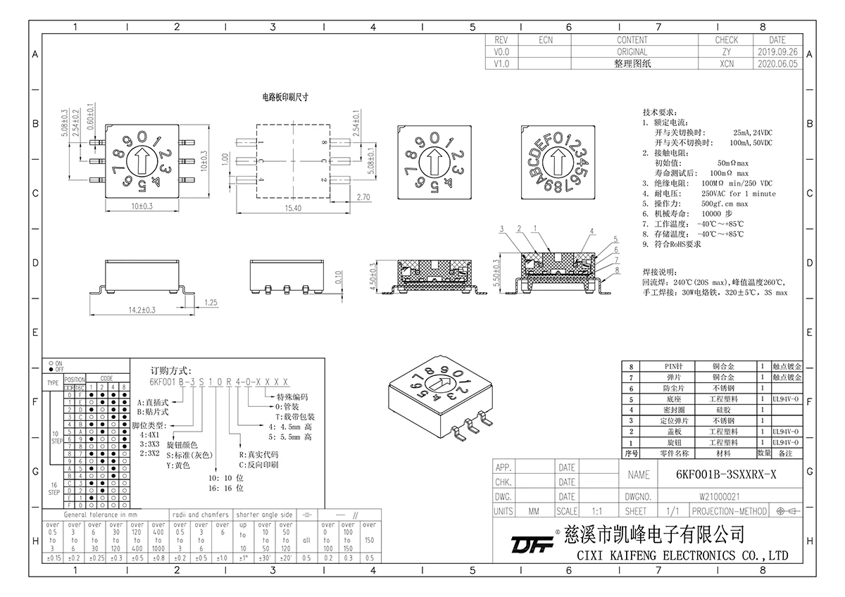旋钮开关 材质电镀:25mA,24VDC 开与关不切换时:100mA,50VDC 接触电阻初始值:50mΩmax寿命测试后:100mΩ绝缘电阻 :100MΩ min/250 VDC耐电压 :250VAC for 1 minute操作力 :500gf.cm max机械寿命 :10000步工作温度 :-40℃~+85℃存储温度 :-40℃~+85℃符合RoHS