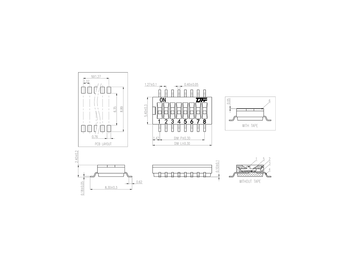 拨码开关 材质电镀:25mA,24VDC开关不切换的额定电流100mA,50VDC接触电阻初始值50mΩ/Max测试后100mΩ/Max绝缘电阻100mΩ/Min.at 500VDC耐电压300VAC/1min拨动力500g/Max拨动行程0.6mm机械寿命2000cycles(Min.)电气寿命1000 cycles/25mA,24VDC使用温度-40℃~+85℃储存
