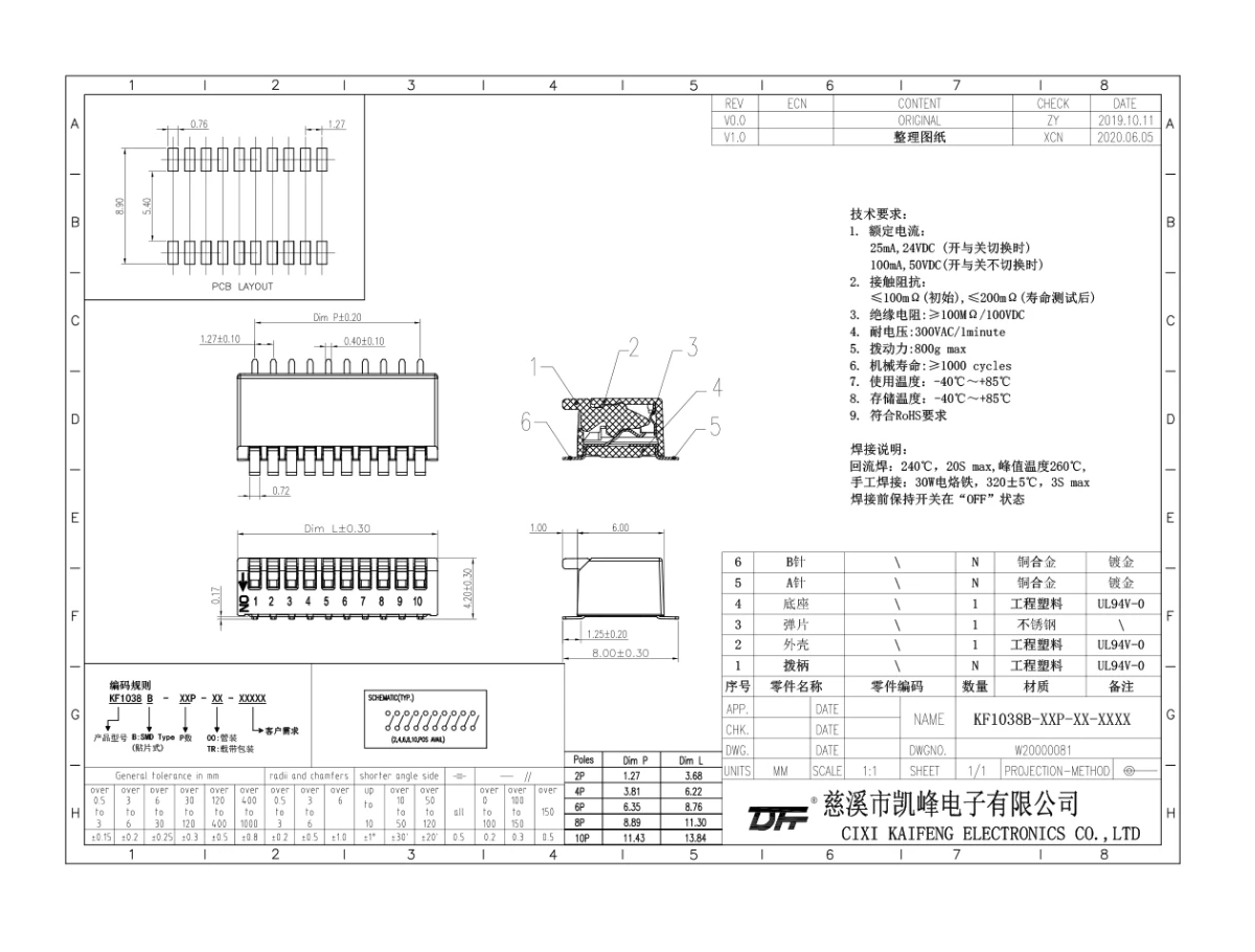 拨码开关 材质电镀:25mA,24VDC开关不切换的额定电流100mA,50VDC接触电阻初始值≤100mΩ测试后≤200mΩ绝缘电阻≥100mΩ/100VDC耐电压300VAC/1min拨动力800g/Max机械寿命≥1000cycles使用温度-40℃~+85℃储存温度-40℃~+85℃材质说明外壳工程塑料,黑色底座工程塑料,黑色拨柄工程塑料,白色PIN针磷青铜镀金焊