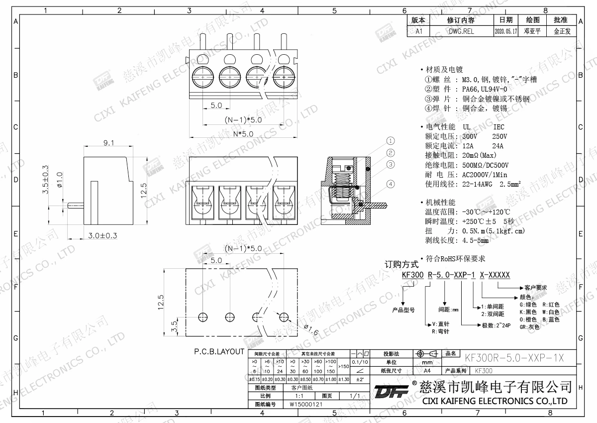 固定式式连接端子 螺丝:M3.0,钢,镀锌,"-"字槽 丨 触点:- 丨 焊针:铜合金,镀锡 丨 塑件:PA66 UL94V-0 丨 电气性能:ULIEC 丨 额定电压:250V-300V 丨 额定电流:12A-24A 丨 接触电阻:20mΩ 丨 绝缘电阻:500MΩ/DC500V 丨 耐电压:AC1250V/1min 丨 使用线径:x-14AWG 1.0-2.5mm² 丨 机械性能温度范围:-40℃~+105℃ 丨 瞬时温度:+250℃,5sec
