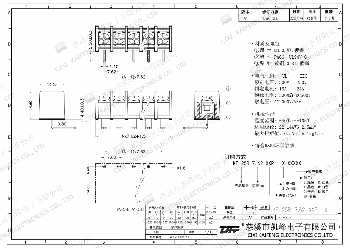 栅栏式接线端子 材质电镀:M3.0 钢,镀镍端子:黄铜,0.8t 镀镍塑件: PA66,UL94V-0电气性能ULIEC额定电压300V 250V 额定电流15A24A绝缘电阻500MΩ/DC500V耐电压AC2000V/1min使用线径22-14AWG 2.5mm²机械性能温度范围-40℃~+105℃ 扭矩0.5N.m 4.4Lb.in