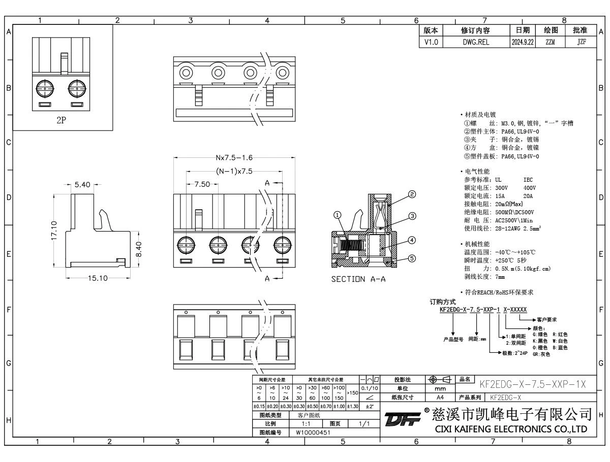 插拔式连接端子 材质电镀:M2.5,钢,镀锌触点: 磷青铜焊针: -塑件: PA66,UL94V-0电气性能ULIEC额定电压300V 400V 额定电流15A20A接触电阻20mΩ绝缘电阻500MΩ/DC500V耐电压AC2500V/1min使用线径28-12AWG 2.5mm²机械性能温度范围-40℃~+105℃ 瞬时温度+250℃, 5s