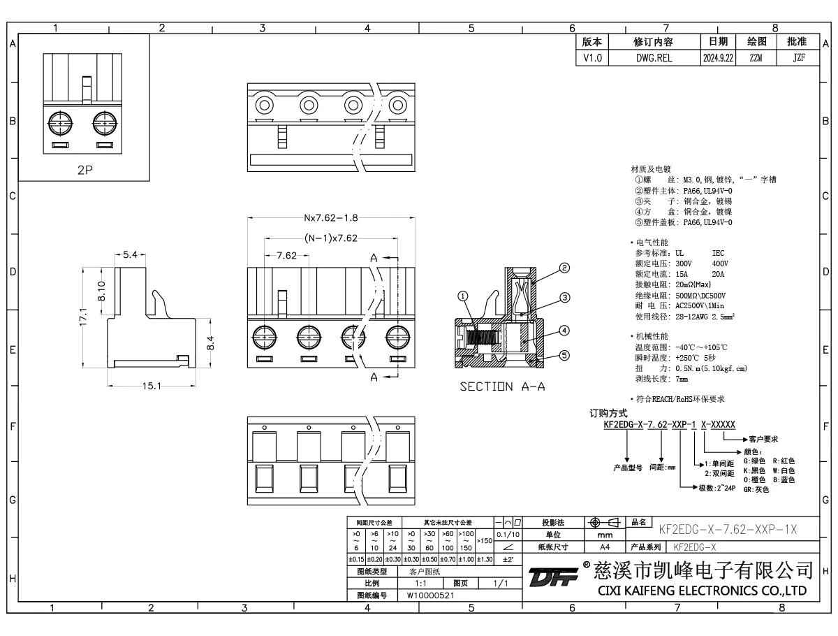 材质电镀:M2.5,钢,镀锌触点: 磷青铜焊针: -塑件: PA66,UL94V-0电气性能ULIEC额定电压300V 400V 额定电流15A20A接触电阻20mΩ绝缘电阻500MΩ/DC500V耐电压AC2500V/1min使用线径28-12AWG 2.5mm²机械性能温度范围-40℃~+105℃ 瞬时温度+250℃, 5s