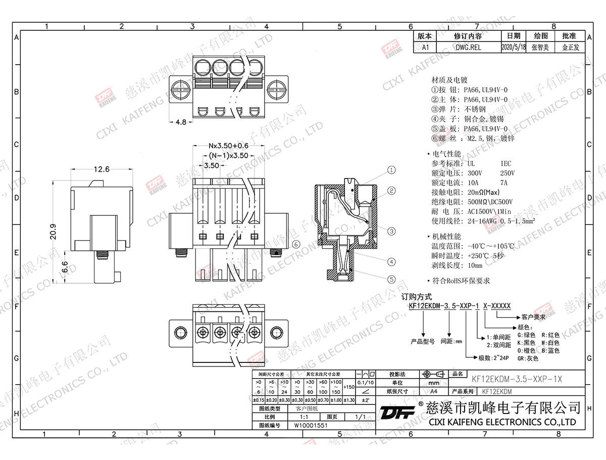 插拔式连接端子 材质电镀:-触点: 磷青铜焊针: -塑件: PA66,UL94V-0电气性能ULIEC额定电压300V 250V 额定电流10A7A接触电阻20mΩ绝缘电阻500MΩ/DC500V耐电压AC1500V/1min使用线径24-16AWG 0.5-1.5mm²机械性能温度范围-40℃~+105℃ 瞬时温度+250℃, 5sec扭矩-