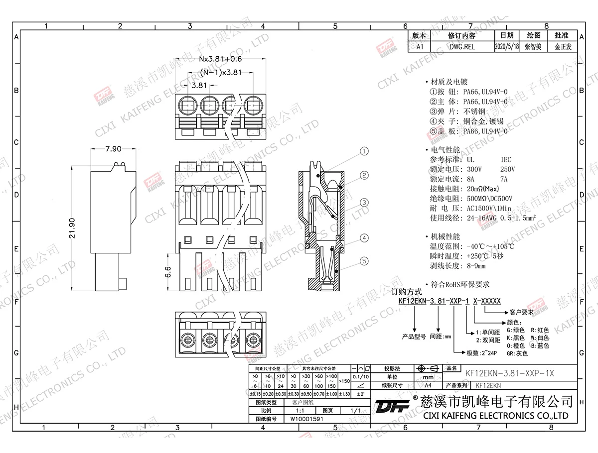 材质电镀:触点: 磷青铜焊针: -塑件: PA66,UL94V-0电气性能ULIEC额定电压300V 250V 额定电流8A7A接触电阻20mΩ绝缘电阻500MΩ/DC500V耐电压AC1500V/1min使用线径24-16AWG 0.5-1.5㎜²机械性能温度范围-40℃~+105℃ 瞬时温度+250℃, 5sec扭矩-剥线长度8-9m